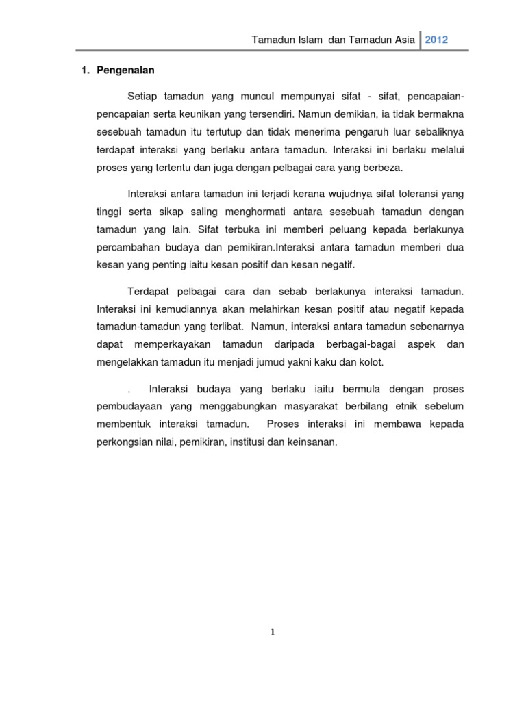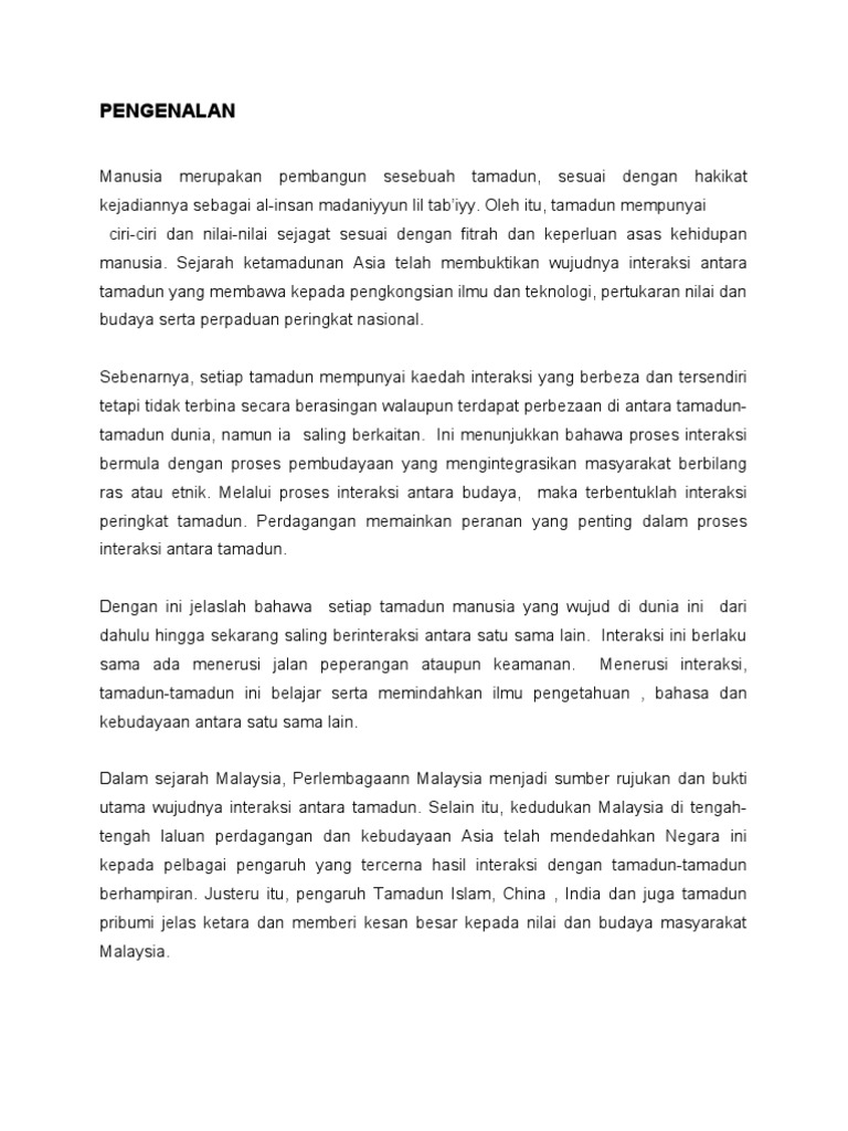 Dalam maksud yang lain, agama islamlah yang melahirkan tamadun. Ciri utama yang kedua bagi agama islam ialah umum. Kemunculan tamadun islam dianggap unik kerana tamadun ini lahir dan berkembang di tempat yang terpencil di kawasan padang pasir yang panas dan kering kontang, iaitu di hijaz. Tamadun melayu merupakan sebuah tamadun yang sangat unik jika dibandingkan dengan tamadun lain daripada segi perkembangannya. Pada kurun yang ke 5, buddhisme telah berkembang dengan baik di semenanjung melayu. Kerana itu, umat islam digalakkan mencari dan menimba ilmu hatta sampai ke negara china. Pada masa yang sama, muncul kegiatan ekonomi yang lebih sempurna seperti kegiatan. Exkavasi arkeologi bukan hanya terhad di kedah sahaja, tetapi didapati di kuala selinsing, tanjung rambutan, lembah kinta, bidor. Umumnya asas tamadun melayu banyak merujuk kepada struktur sosial masyarakat yang berlapis seperti sistem kasta, kerana banyak dipengaruhi oleh. Madaniyyat, hadharah, thaqafah dan umran. Tamadun islam juga mewujudkan keseimbanagn dalam hubungan. Topik 3 membincangkan keagungan empayar islam satu masa dahulu telah memberikan sumbangan yang amat besar dalam. Ini kerana tamadun china memiliki sifat terbuka dan saling berinteraksi dengan tamadun yang lain.
